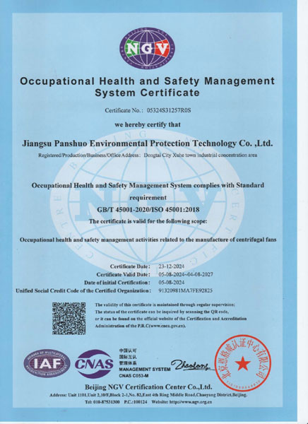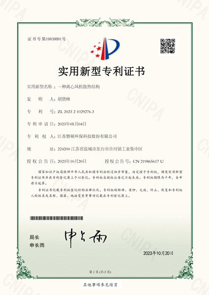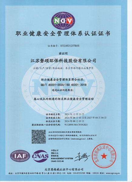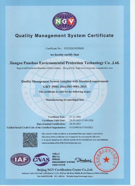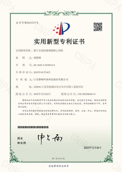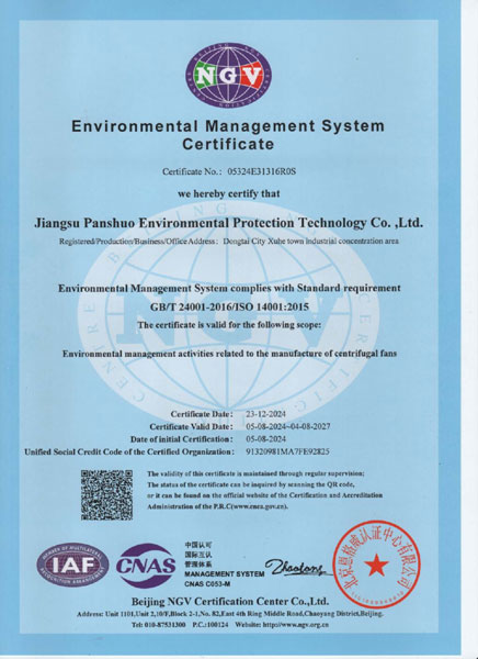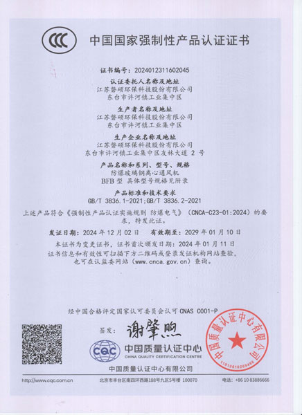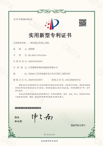 公司成立于2022年1月,生产基地位于江苏省东台市许河镇工业集中区友林大道2号,工厂已于2022年8月正式投产,主要生产离心风机、玻璃钢风机、防爆风机、FRP风机、不锈钢风机、防腐风机、高压风机、保温风机、除尘风机,脱硫风机、酸洗塔、吸附塔及生物除臭等环保设备,获得国家专利证书二十多项,并拥有AMCA认证,CQC节能认证、CCC防爆认证,B1(B)级阻燃认证、WF2防腐认证、CNAS实验第三方一级能效认证等多项专业资质,通过并拥有ISO9001、ISO14001、ISO45001三项管理体系认证。