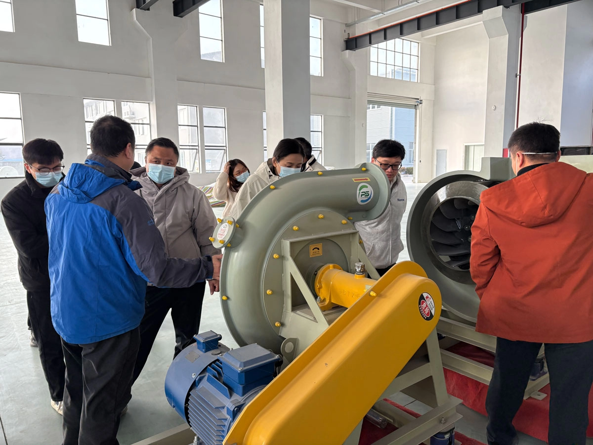 在磐硕公司技术团队的引导下,企业家们参观了风机生产车间与研发中心。重点了解了磐硕风机在材料创新、结构设计及智能制造方面的突破。公司负责人介绍,其玻璃钢风机产品通过复合材质优化,在耐腐蚀与轻量化方面形成独特优势,可适配电子、化工等多行业需求。
