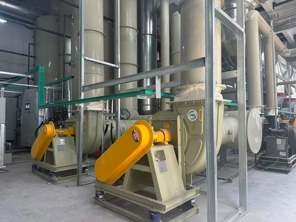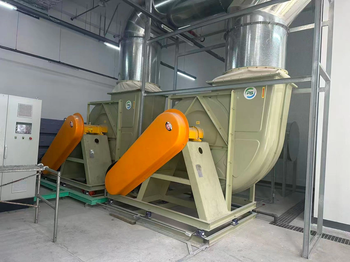 江苏磐硕环保科技股份有限公司凭借在特殊工况通风领域的技术积累,针对上述需求提供了定制化设计。方案的核心是部署由我司生产制造的玻璃钢离心风机。此类离心风机的过流部件采用整体成型的玻璃纤维增强复合材料制作,其材质本身对多种酸、碱介质具备良好的惰性。数台玻璃钢离心风机被集成到该工艺排气系统中,负责将蚀刻与清洗工位产生的气体安全引出。