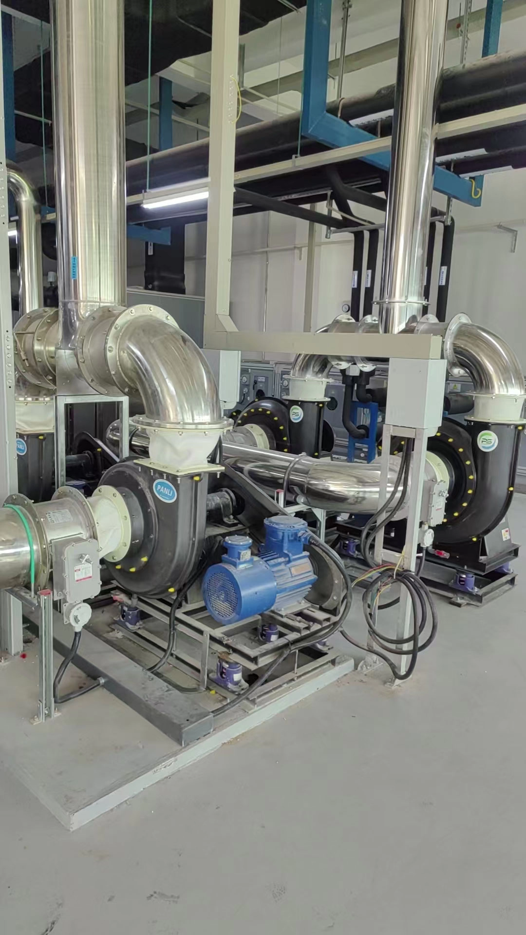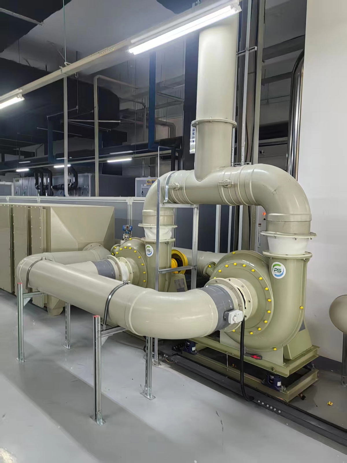 江苏磐硕环保科技股份有限公司在评估该工艺段的排气需求与环境特点后,提供了针对性的通风解决方案。方案的核心是部署具备相应安全特性的防爆玻璃钢风机。这类风机采用防爆玻璃钢材质,能耐受多种化学介质,同时其电机、接线盒等电气部分均按特定标准设计,以适应存在可燃气体的环境。我们根据车间的气体产生量、空间布局与安全分区,规划了多台防爆玻璃钢风机的安装位置与管路走向。